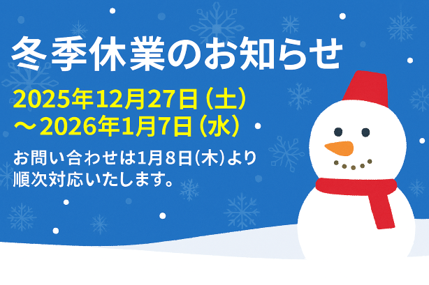 平素より保険マスターをご利用いただき、誠にありがとうございます。 誠に勝手ながら、下記の期間を冬季休業とさせていただきます。 ■休業期間2025年12月27日(土)~2026年1月7日(水) 休業期間中にいただいたお問い […]